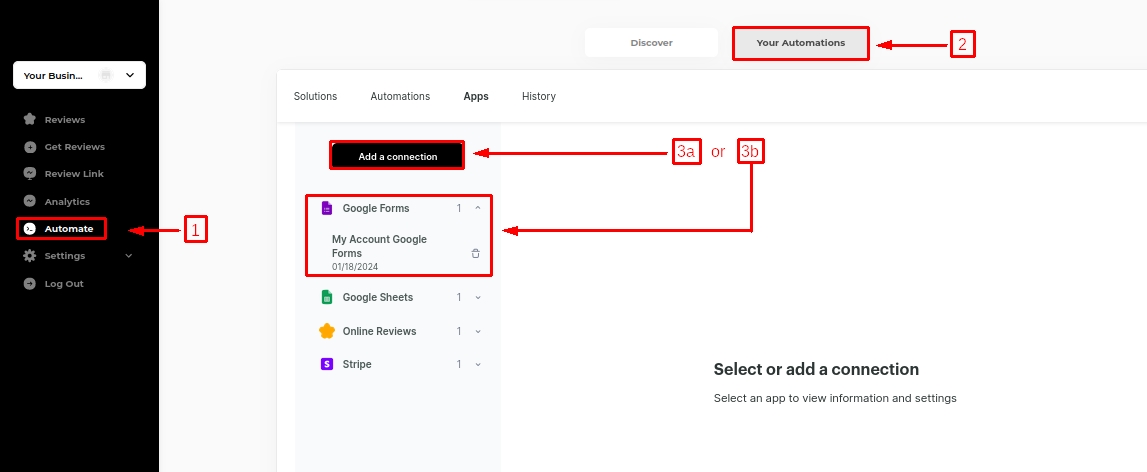 In this section you can either add a connection, select an app to view information and settings, or delete your connections.