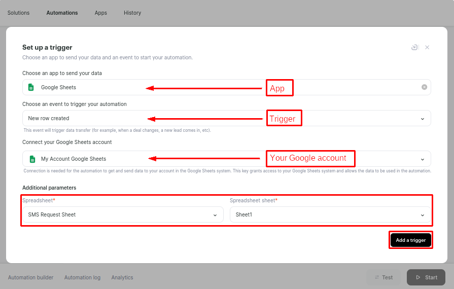 Add a trigger: Choose an app (in this case Google Sheet) to send your data and select an event to initiate your automation. (See "Add a Trigger" below for more details)