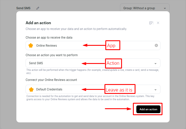 Add an action: Choose an app (in this case Online Reviews) to receive your data and specify an action to perform automatically. (See "Add an Action" below for more details)