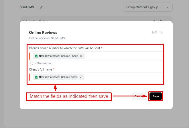 Afterward: An "Online Reviews: Send SMS" pop-up will appear. Match the fields with their corresponding fields in your Google sheet as shown in the image below.