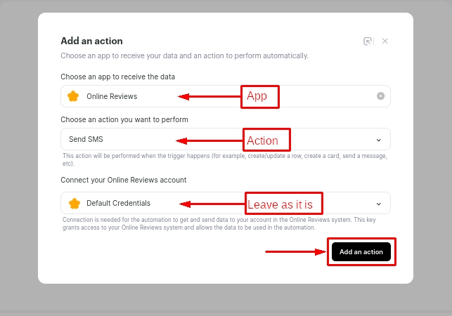 Add an action: Choose an app (in this case Online Reviews) to receive your data and specify an action to perform automatically. (See "Add an Action" below for more details)