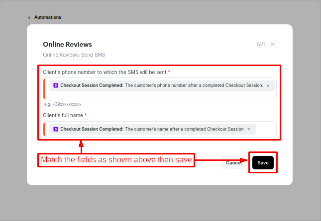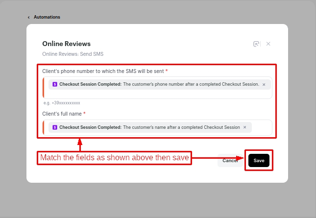 Afterward: An "Online Reviews: Send SMS" pop-up will appear. Match the fields with their corresponding fields in Stripe as shown in the image below.