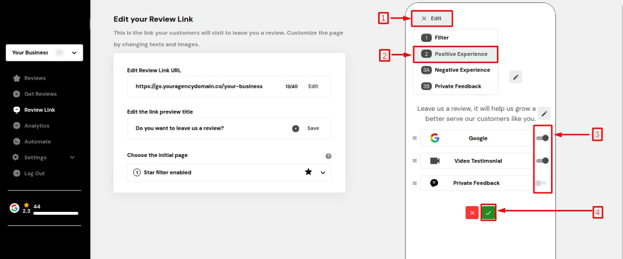 Click the pen icon to enable or disable platforms to showcase on the Review Link under the Positive Experience section. Save changes by clicking the green checkmark button.