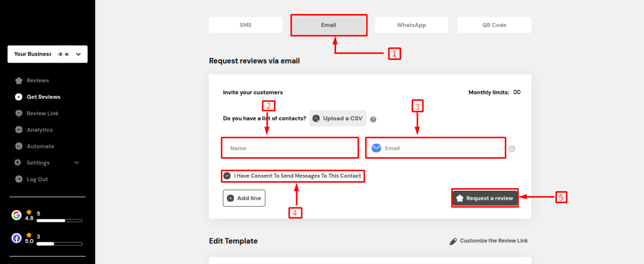 On the email request page, enter the customer's name and email addrress.