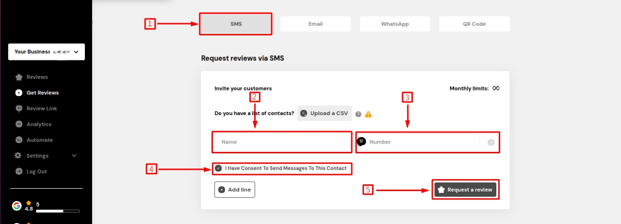Note: The sender’s name should not include special characters, and the number should include the prefix/country code (e.g., +44 for country code 44).