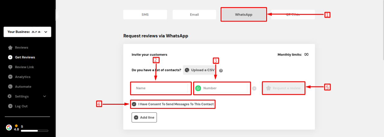 In the app under "Whatsapp Requests," enter the customer's name and their telephone number (ensure to include the prefix in the telephone number).