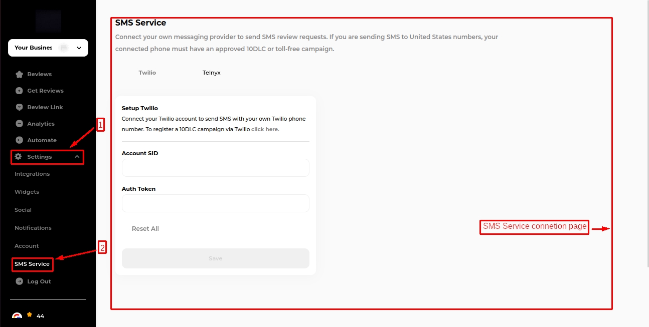 The SMS Service feature enables you to connect your preferred messaging provider for sending SMS review requests. Currently, we support Telnyx and Twilio. Please be aware that for SMS to United States numbers, your connected phone must have an approved 10DLC or toll-free campaign.