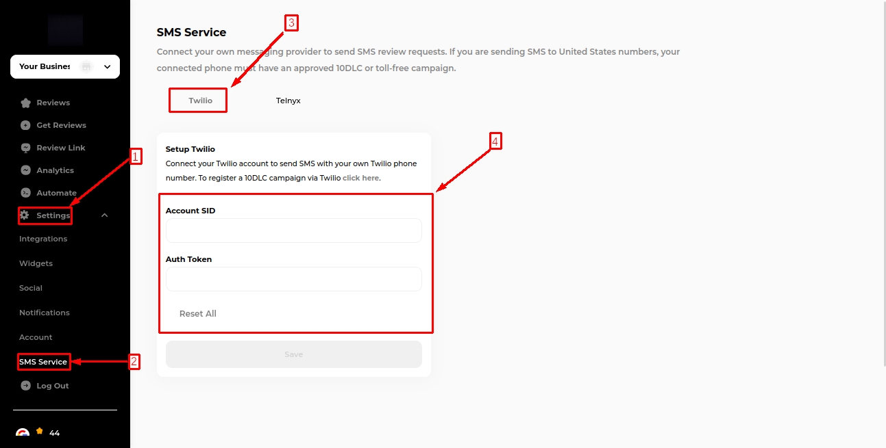 Set up Twilio by entering your Account SID and Auth Token. Once complete, click Save to apply changes. You can then select the desired number.